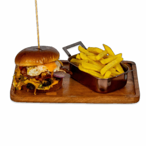 Unser Premium-Burger: Patty mit Cheddar, Jalapeños, Spiegelei, Bacon, Burgersauce, Salat, ...