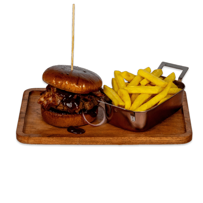 Saftiges Patty mit rauchiger BBQ-Sauce, knusprigem Bacon, frischem Salat, Tomate und Zwiebeln ᵃ ᵈ ⁸ ³