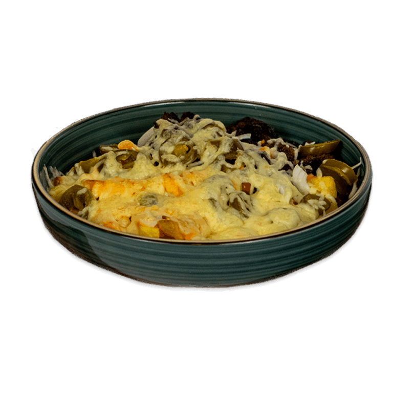 Pitabrot mit würzigem Rinderhack, Burgersauce, Jalapeños, Zwiebeln, knusprigen Pommes und geschmolzenem Gouda ᵃ ᵈ ⁸