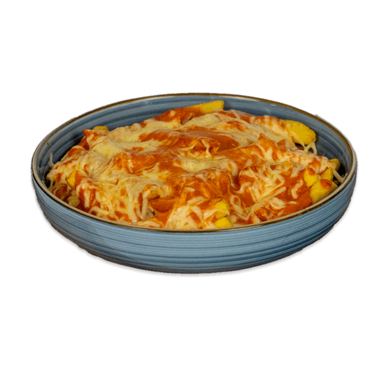 Veggie-Patty mit Metaxasauce, Jalapeños, Zwiebeln, Pommes und Gouda auf überbackenen Pitabrot ᵃ ᵈ ᵒ